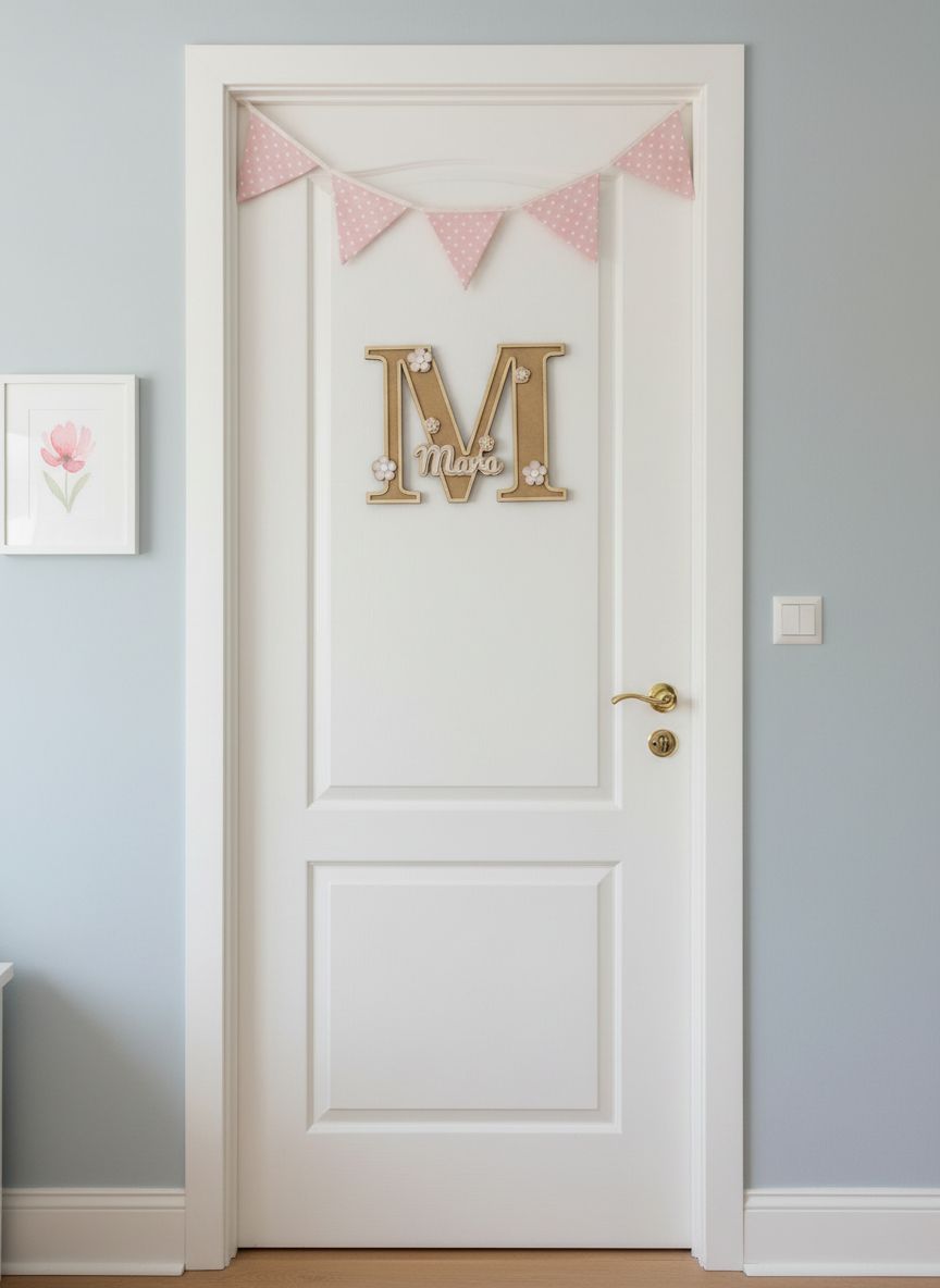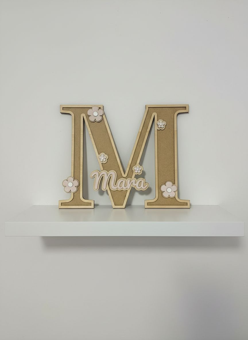 Un detalle perfecto para regalar a nuestros peques, su inicial a tamaño superior en madera natural y el nombre de la niña más pequeño, y pintado a mano.