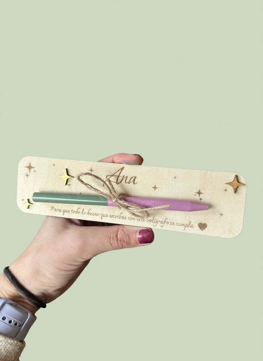 En madera natural, con el texto grabado y detalle de estrellas en dorado.